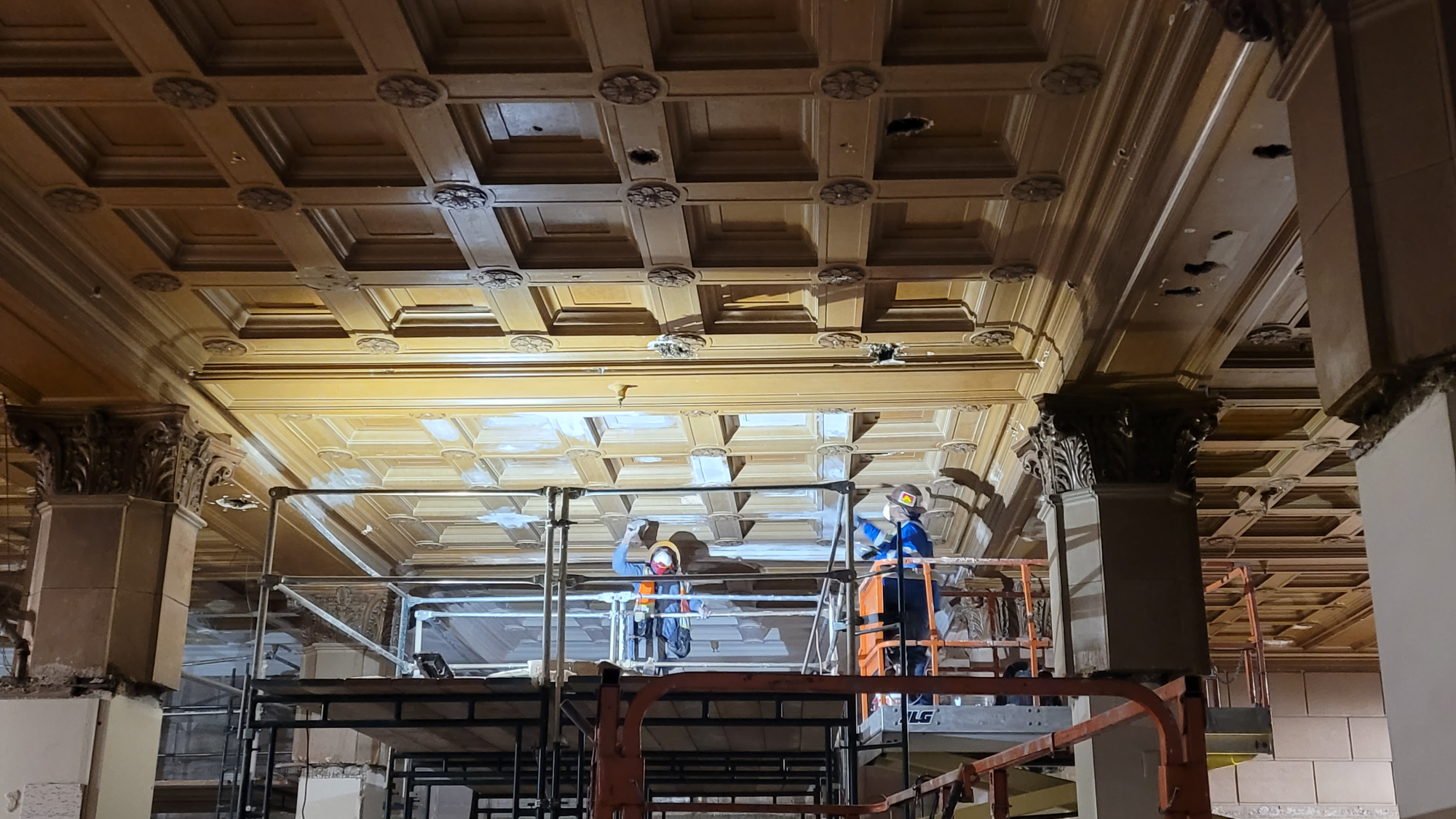 The completed restoration returned the ceiling to its original grandeur while ensuring long-term durability. The decorative coffer patterns and column details were faithfully reproduced, preserving this piece of Downtown LA's architectural heritage for future generations.